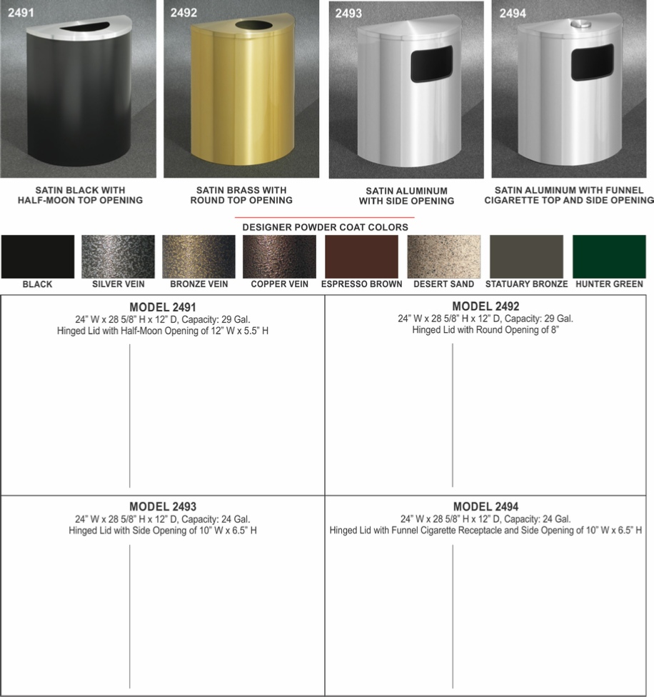 Glaro Half-Round Profile Series Receptacles fit nicely against a wall but have a capacity to compete against larger receptacles. Each model has a plastic liner and the ash/trash combo has a fully separate cigarette receptacle built into the hinged lid.