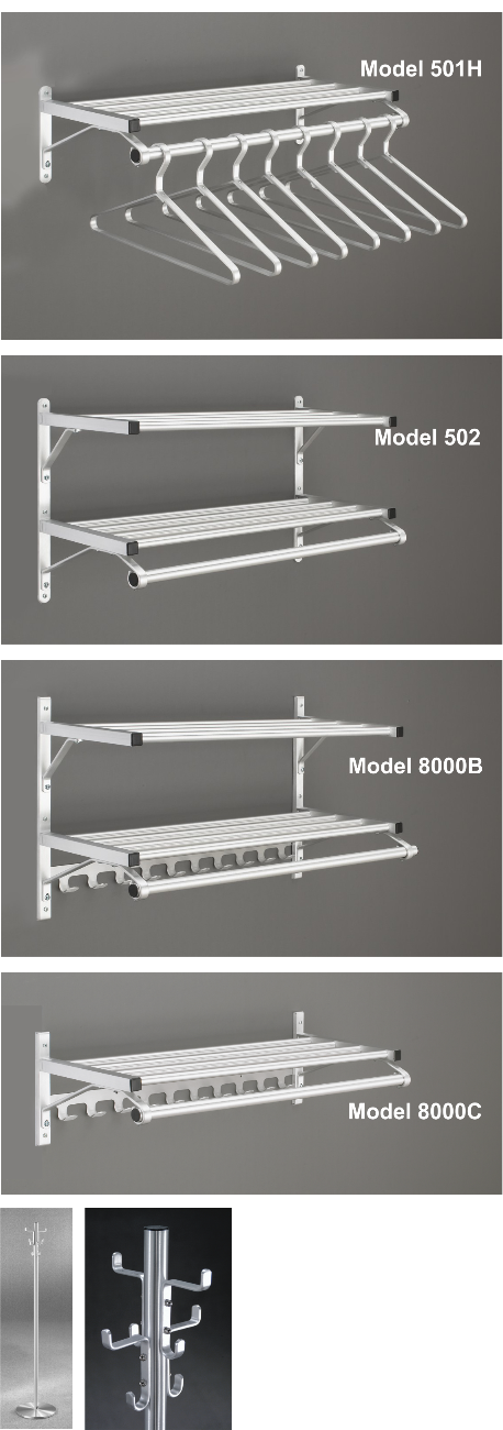 The Glaro Model 502 Wall Mounted Coat Rack has 2 Shelves for More Storage. This model of rack is often used in schools and gyms. It does not come with hangers. Hangers may be ordered separately here.
